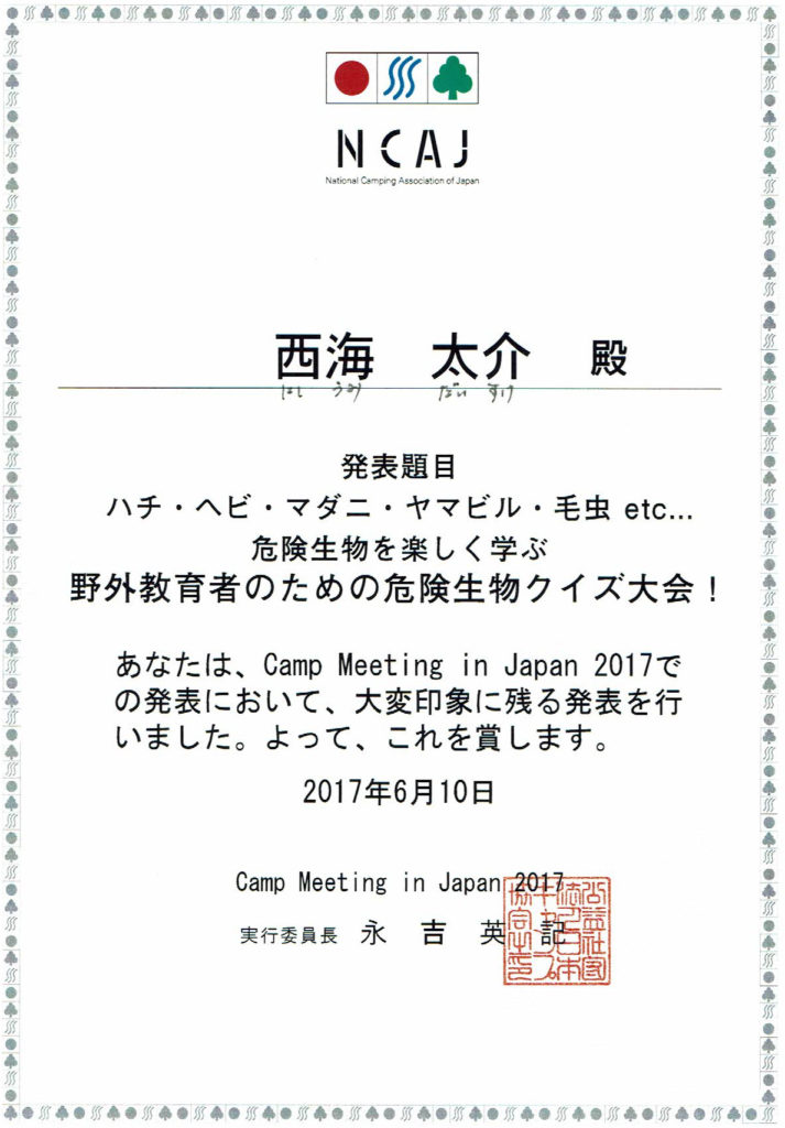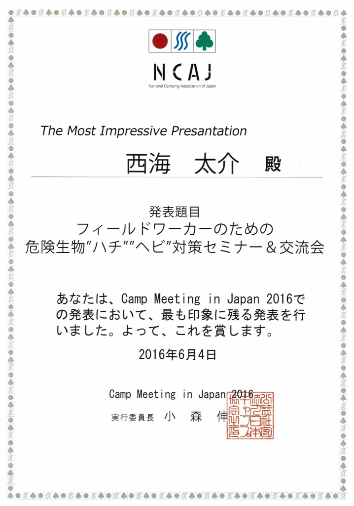 - Workshop of considering safety about wasps and snakes for field workers. (Oct.31, 2016. The 6th Asia Oceania Camping Congress 2016. National Camping Association of Japan)